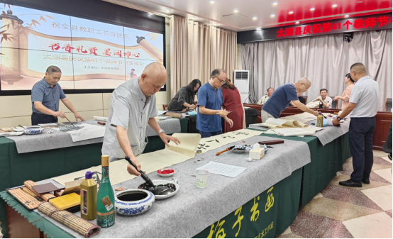 在第41个教师节来临之际,太湖县政协教育界别活动室联合赵四梅委员书画艺术服务工作室,在太湖县教育局三楼举办“书香礼赞 墨润师心”主题书画笔会。太湖县政协副主席占卓夫参加活动。