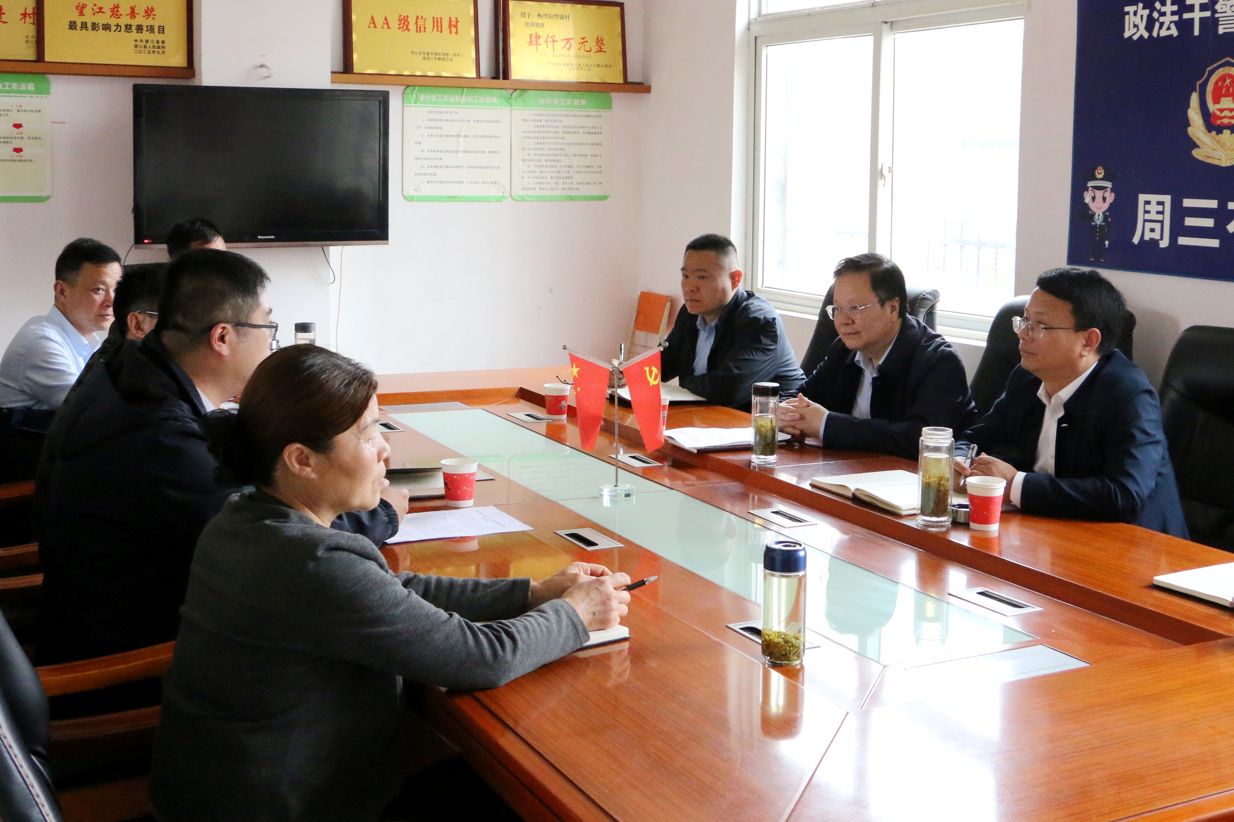 在村会议室,周华斌一行与中共杨湾镇党委书记徐明、包村点长、村两委和驻村工作队开展座谈。储登界向村两委送达了《农工党安庆市委会2026年度乡村振兴定点帮扶工作计划》,双方就年度帮扶计划的落实展开了深入的探讨,并对具体帮扶措施进行了谋划,还听取了曾墩村2025年度工作汇报及2026年度工作计划。